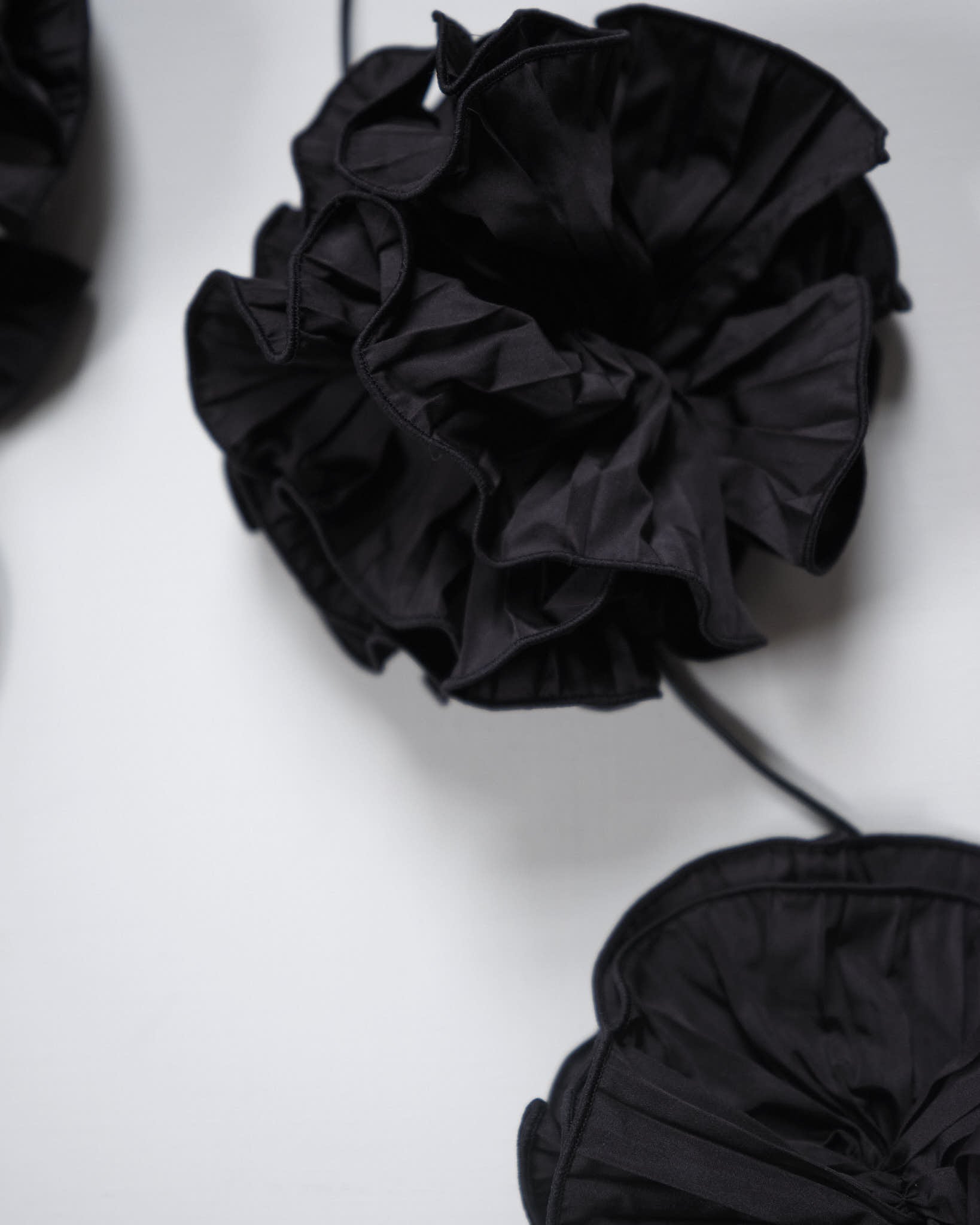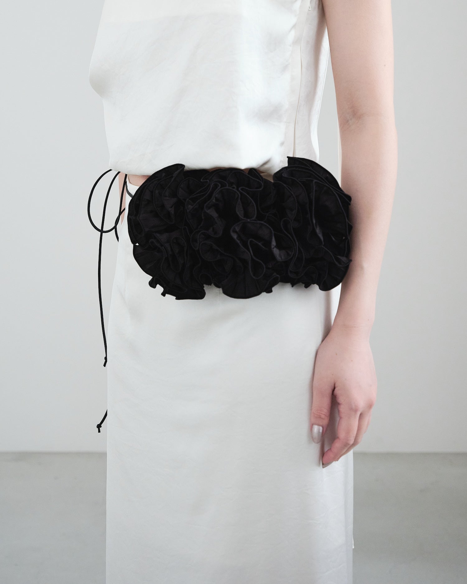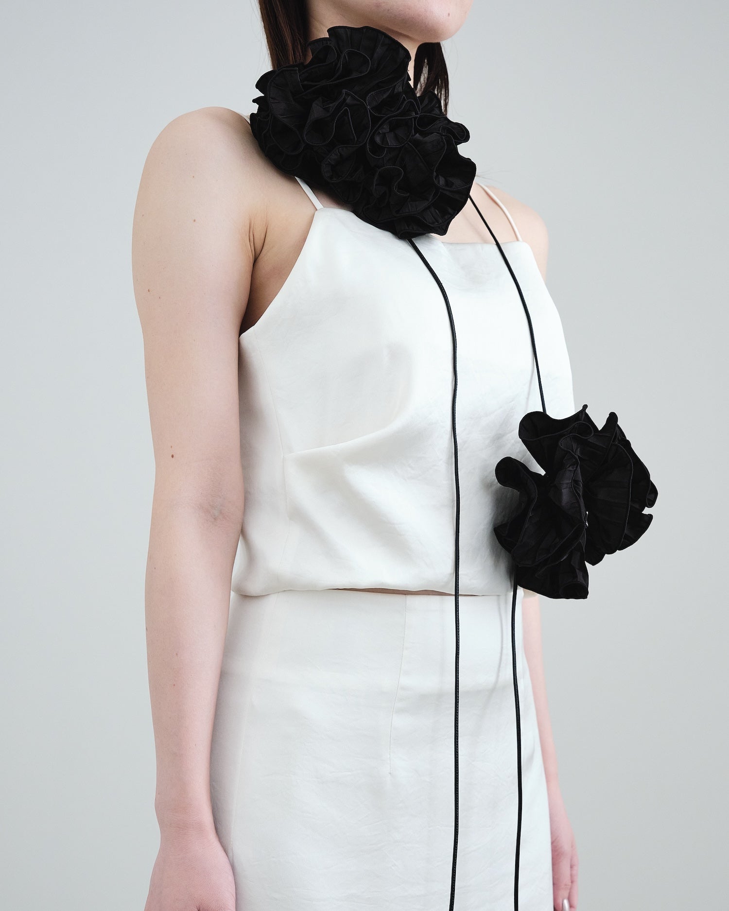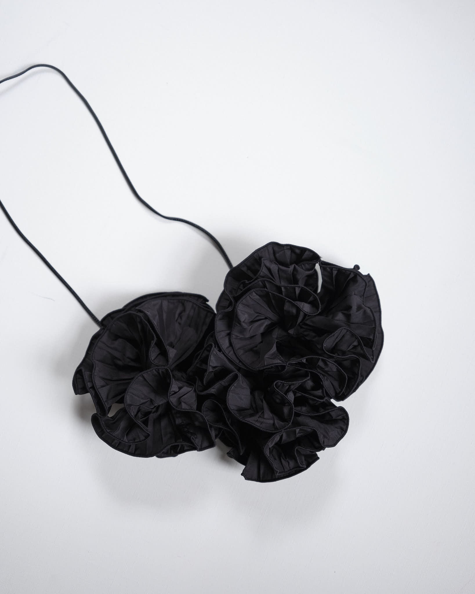 プリーツ加工が施されたタフタのラウンドモチーフネックレス。モチーフは可動式のためお好みの配置が可能です首に巻いたりウエストに巻いたり様々な使い方を楽しんでいただけるアイテムです。