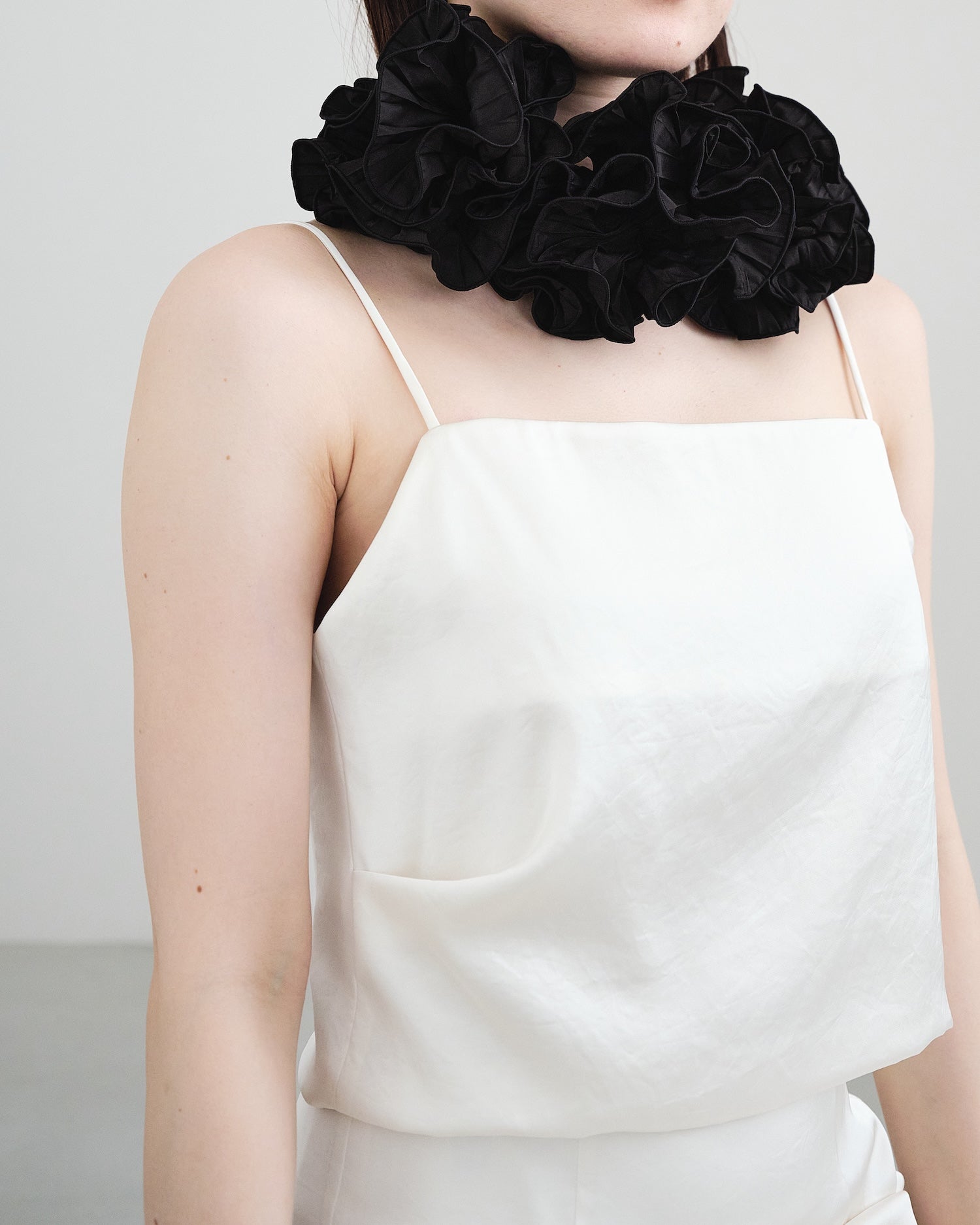 顔まわりに巻くと華やかになりウェディングシーンやオケージョンなどドレスアップアイテムとしての着用ができます。