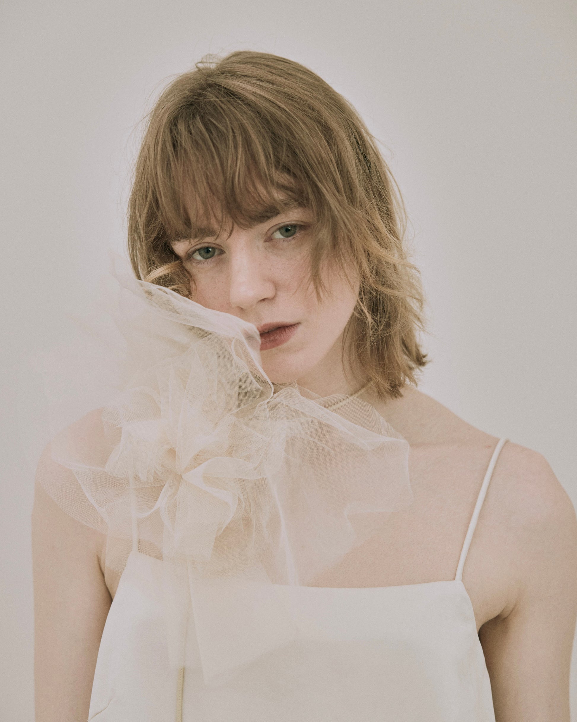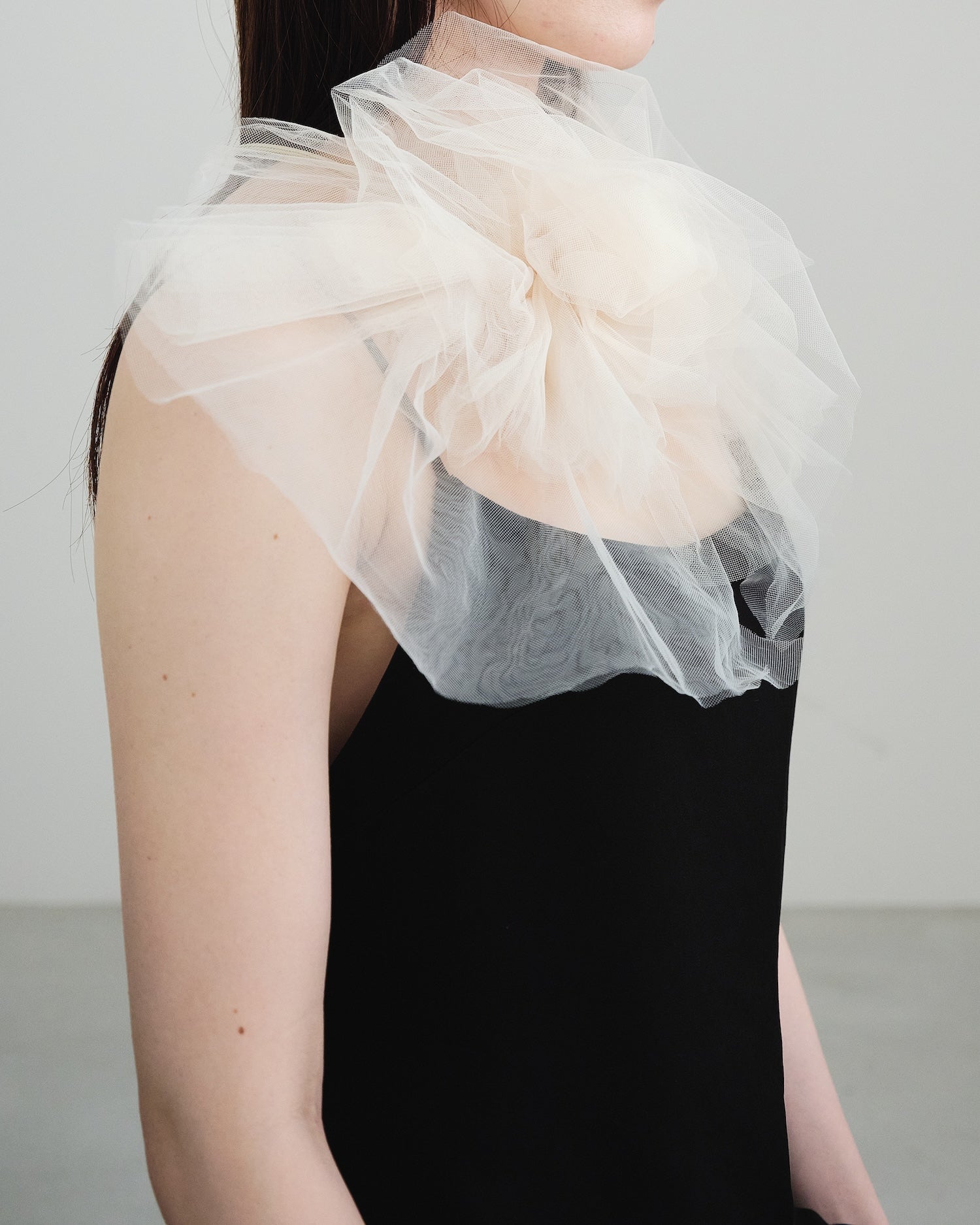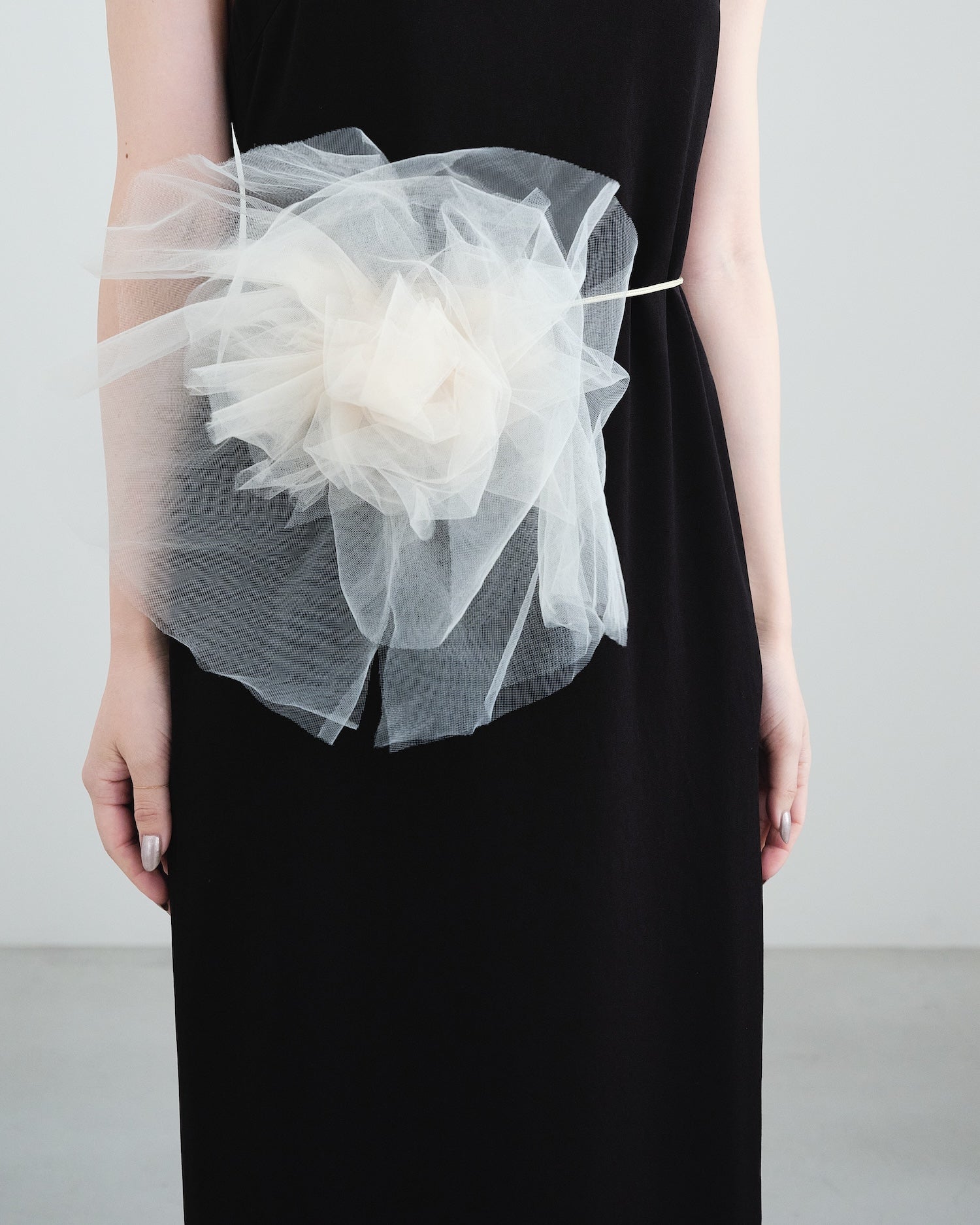 チュールのフラワーモチーフは動かせる仕様となっておりアレンジが可能。顔まわりに巻くと華やかになりウェディングシーンやオケージョンなどドレスアップアイテムとしての着用ができます。