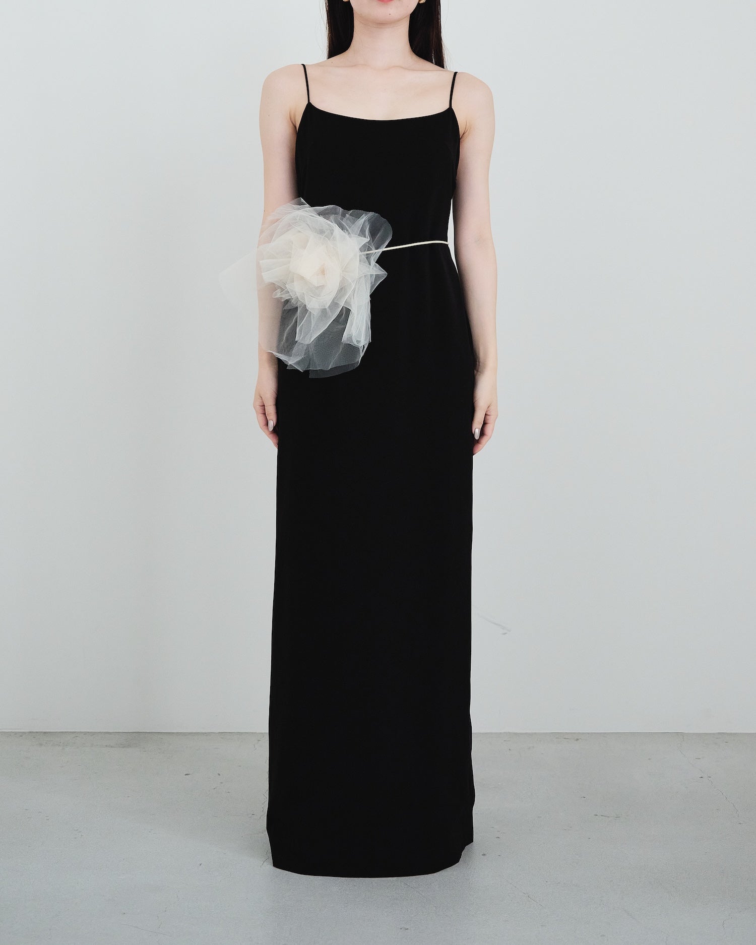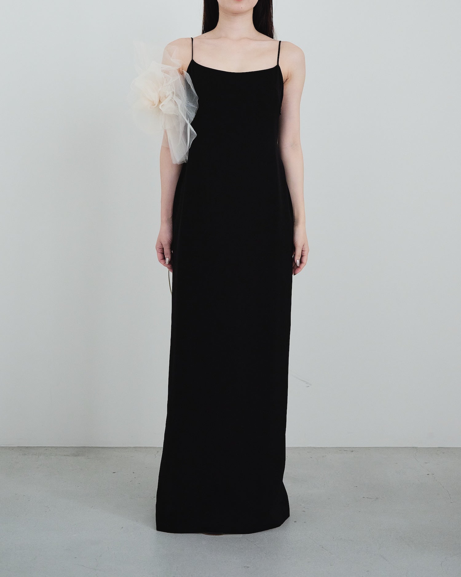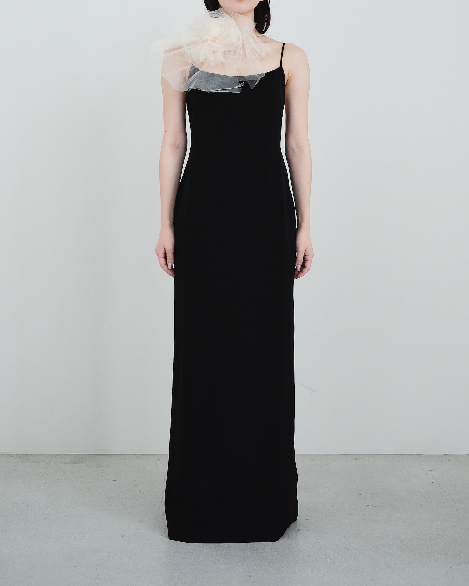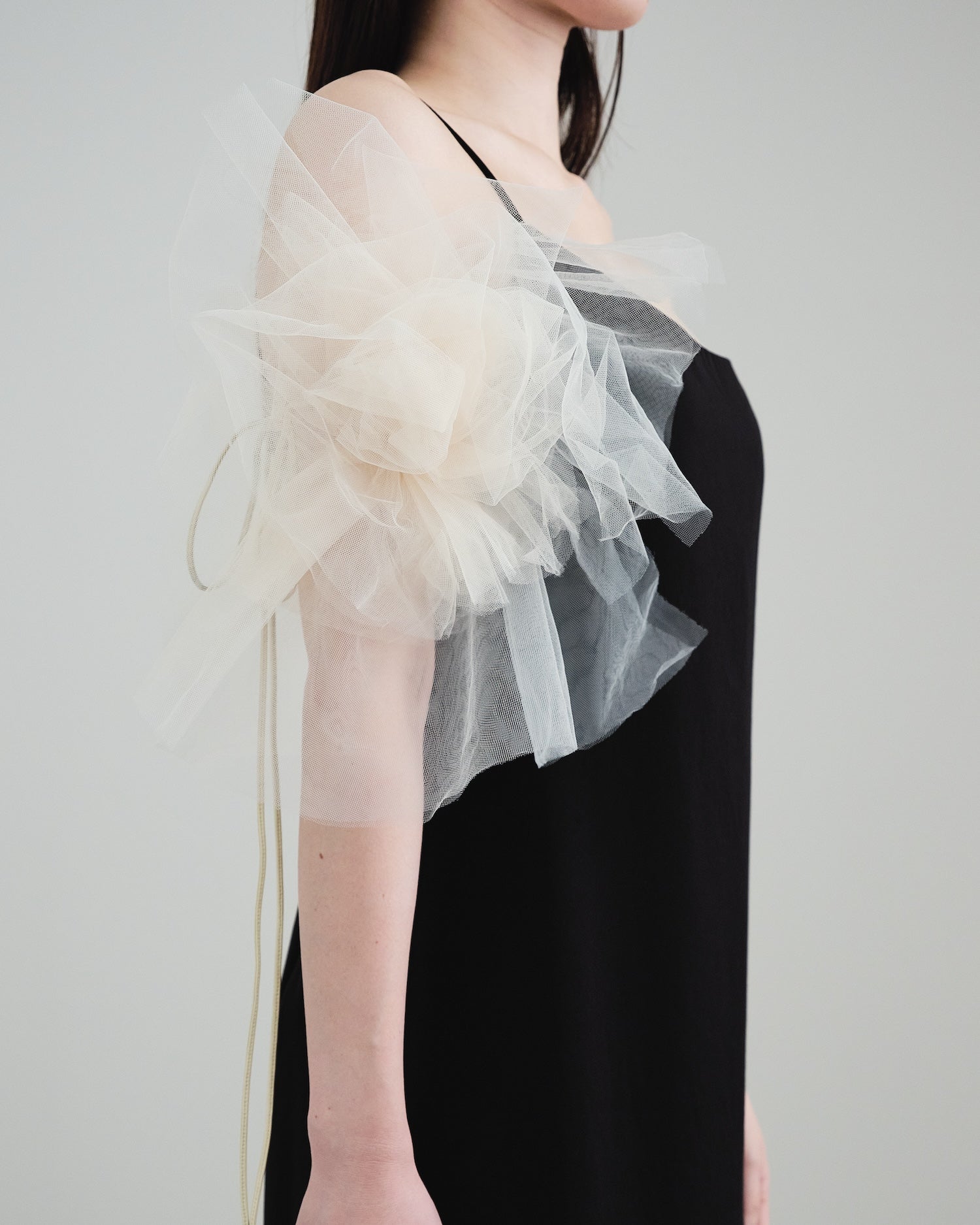 チュールのフラワーモチーフは動かせる仕様となっておりアレンジが可能。顔まわりに巻くと華やかになりウェディングシーンやオケージョンなどドレスアップアイテムとしての着用ができます。