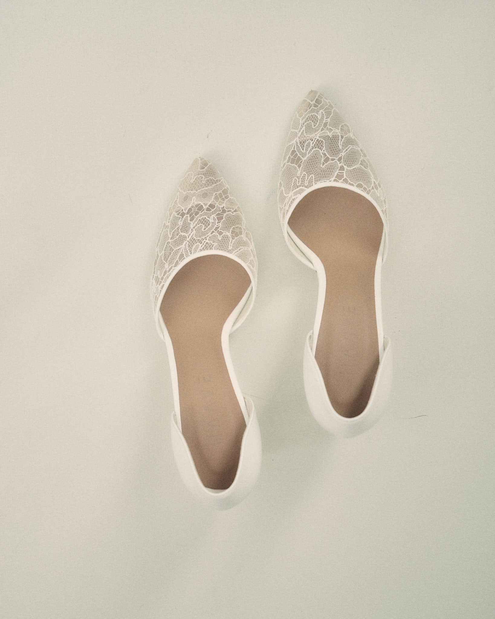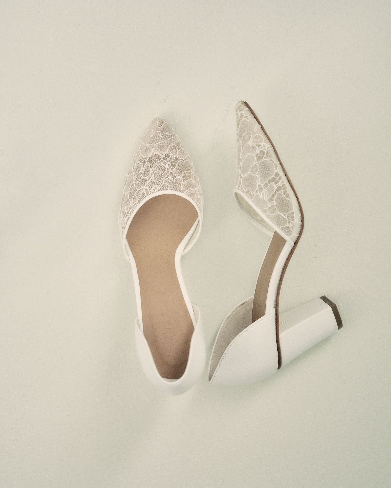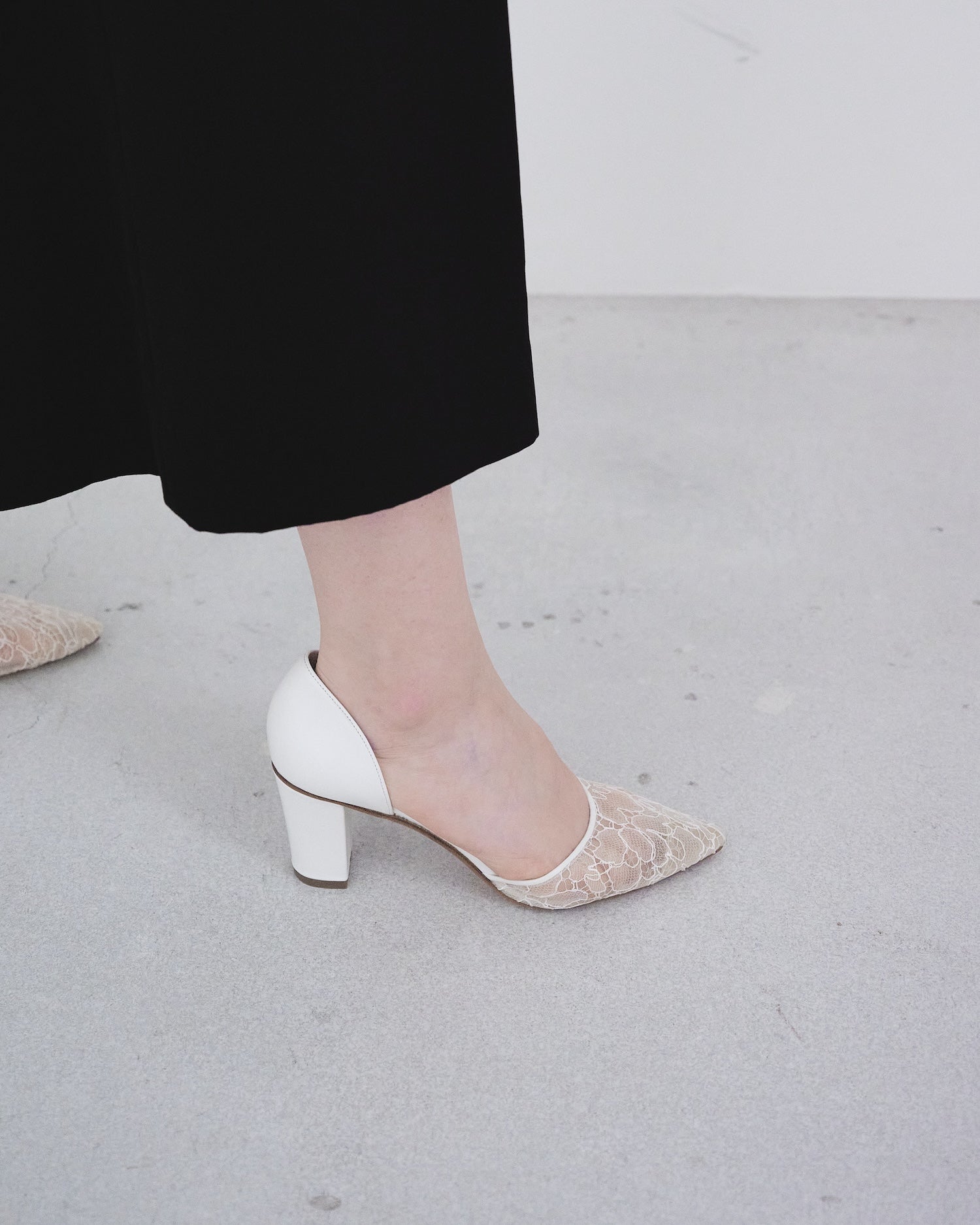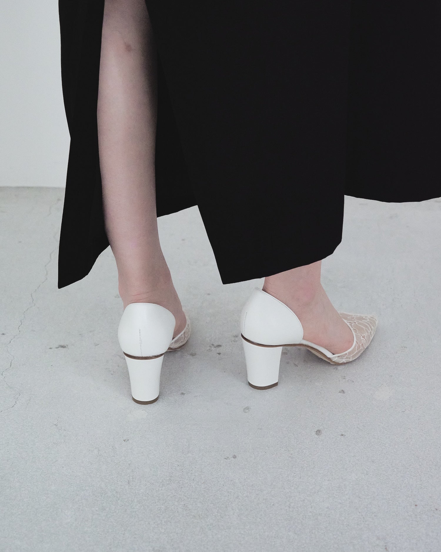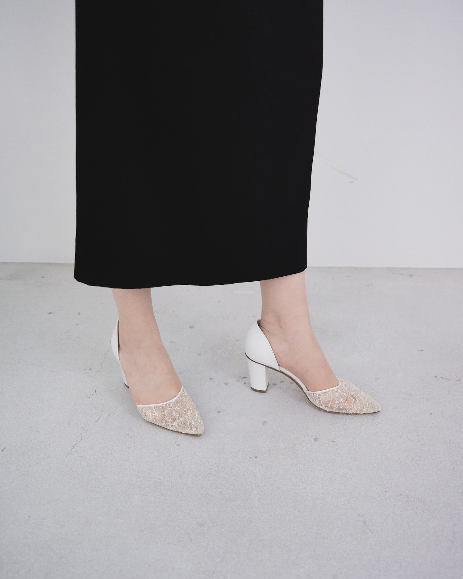 フランスの老舗レースメーカー〈Solstiss(ソルティス)〉よりセレクトした、リバーレースで仕立てたオープンサイドパンプス。上品で肌馴染みの良いオフホワイトを採用し、フェミニンな表情をもつ繊細なシアーレースが足元をやわらかに彩ります。ポインテッドトゥにあえてチャンキーヒールを合わせることで、クラシカルな美しさにモードな要素をプラスし、凛とした大人の女性を演出します。ウェディングシーンでは花嫁の一足として、セレモニーから二次会、ブライダルフォトまで幅広く活躍。特別な一日を華やかに彩るにふさわしい存在感です。オケージョンシーンでもドレスやフォーマルスタイルに品よく寄り添い、レースの繊細なニュアンスが装いを一層引き立てます。さらにデイリーにも取り入れやすい洗練されたデザインで、シーンを問わず愛用できる万能パンプスです。