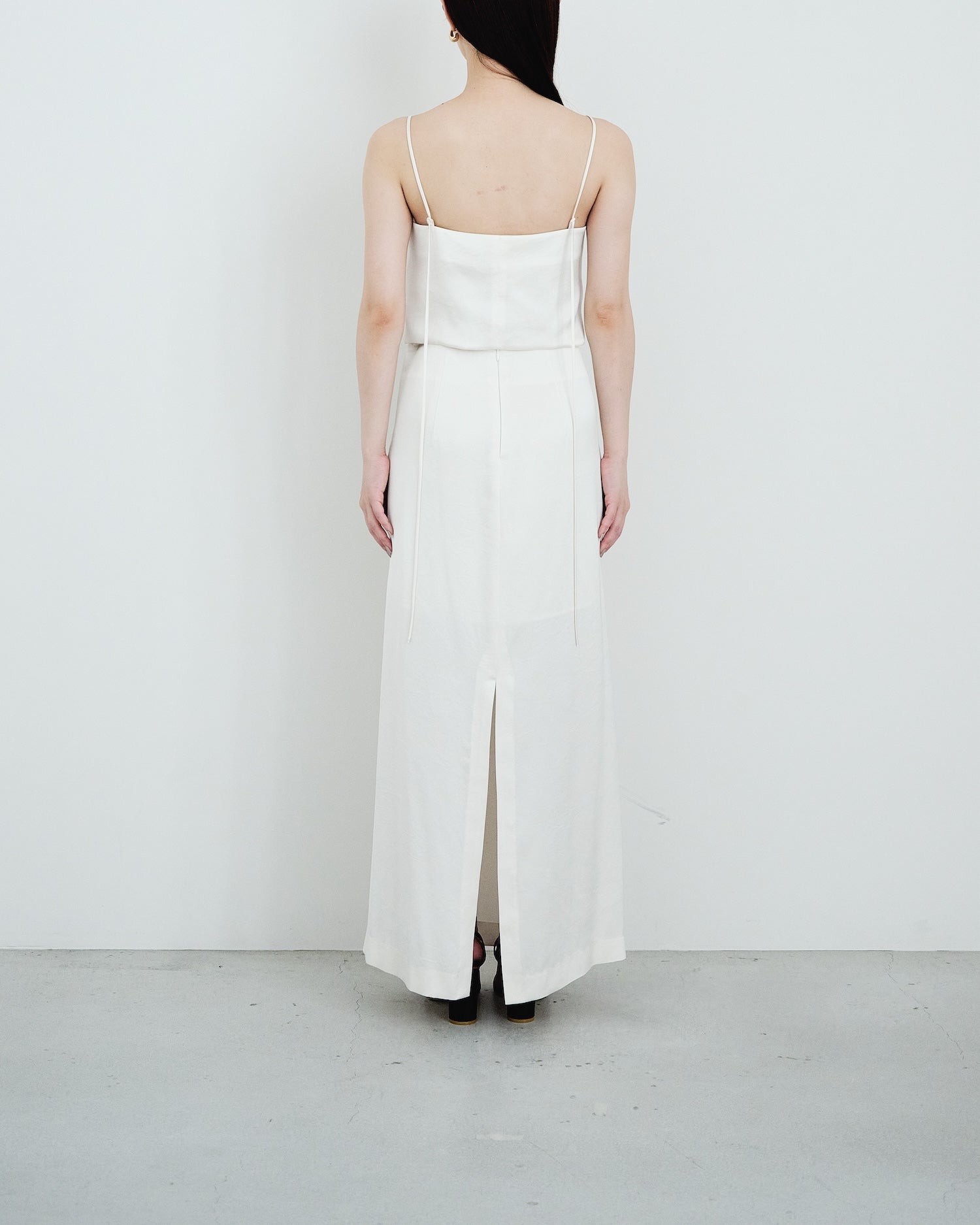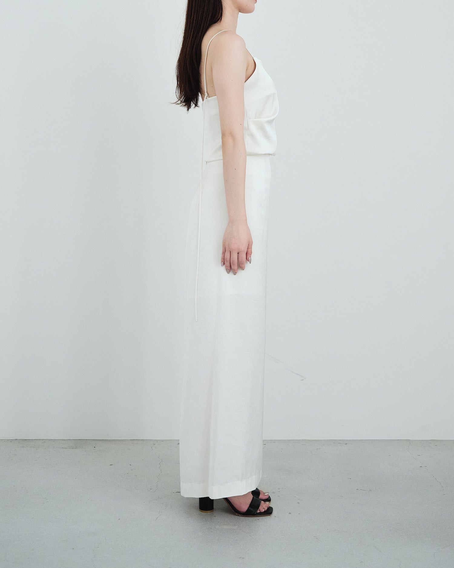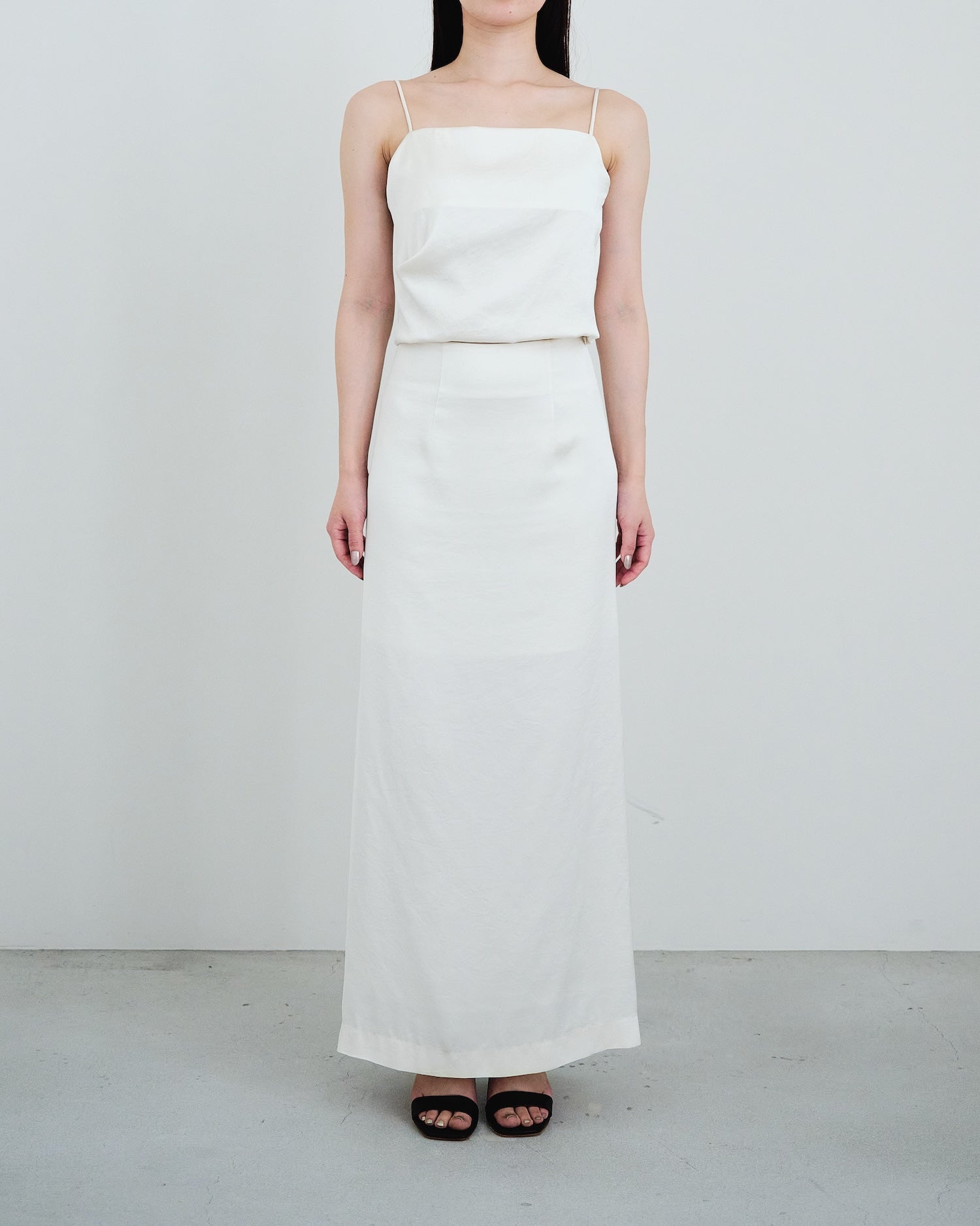 程よい光沢感とサイドのさりげないタックデザインのトップスは、別売りのサテンストレートマキシスカートとの組み合わせでセットアップとしてオケージョンシーンにも着用が可能。オケージョンからデイリーまで幅広く着用できるキャミソールトップスです。