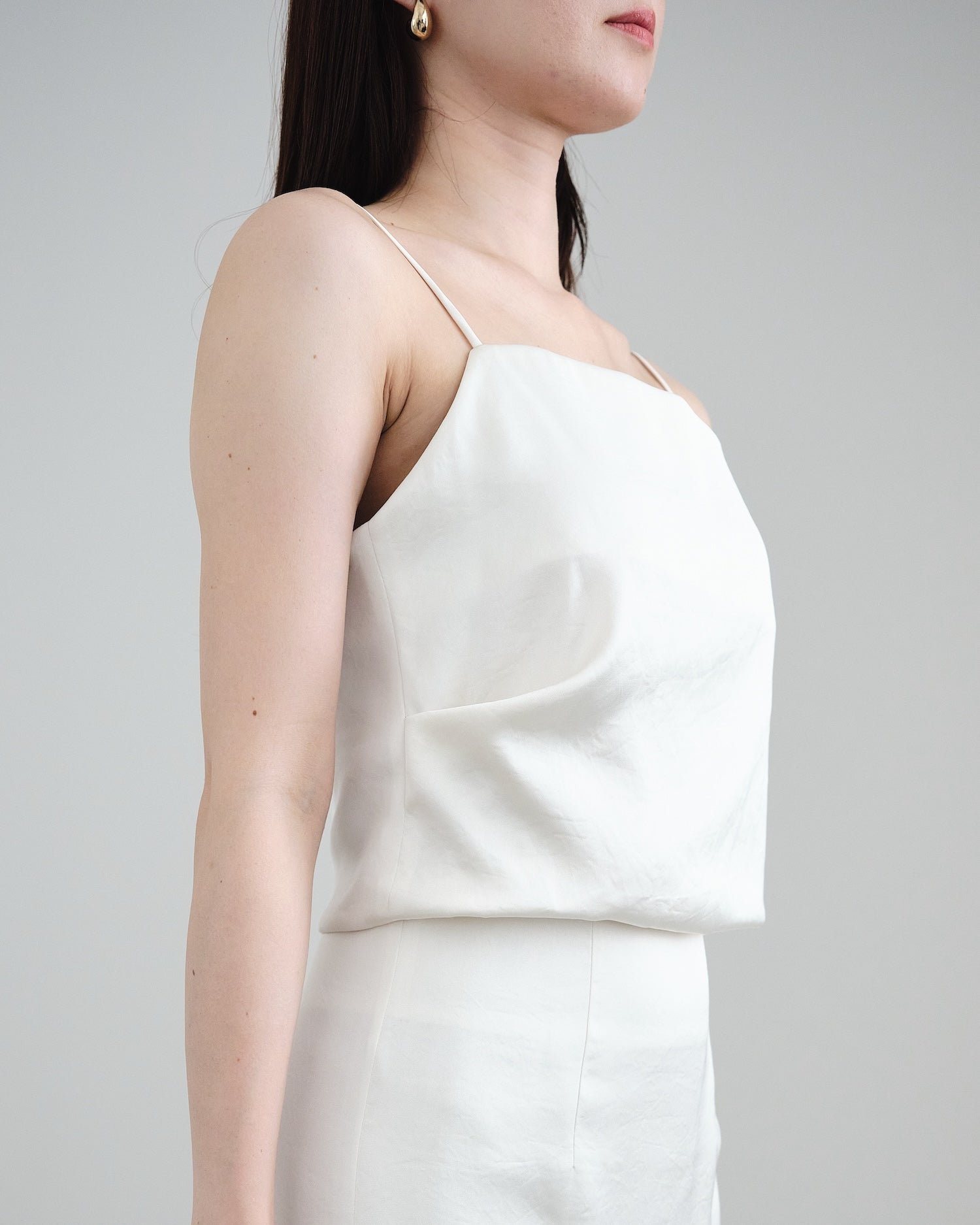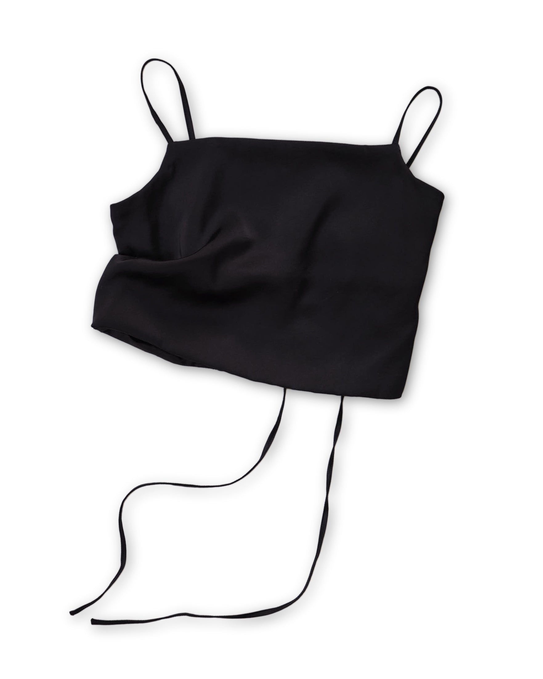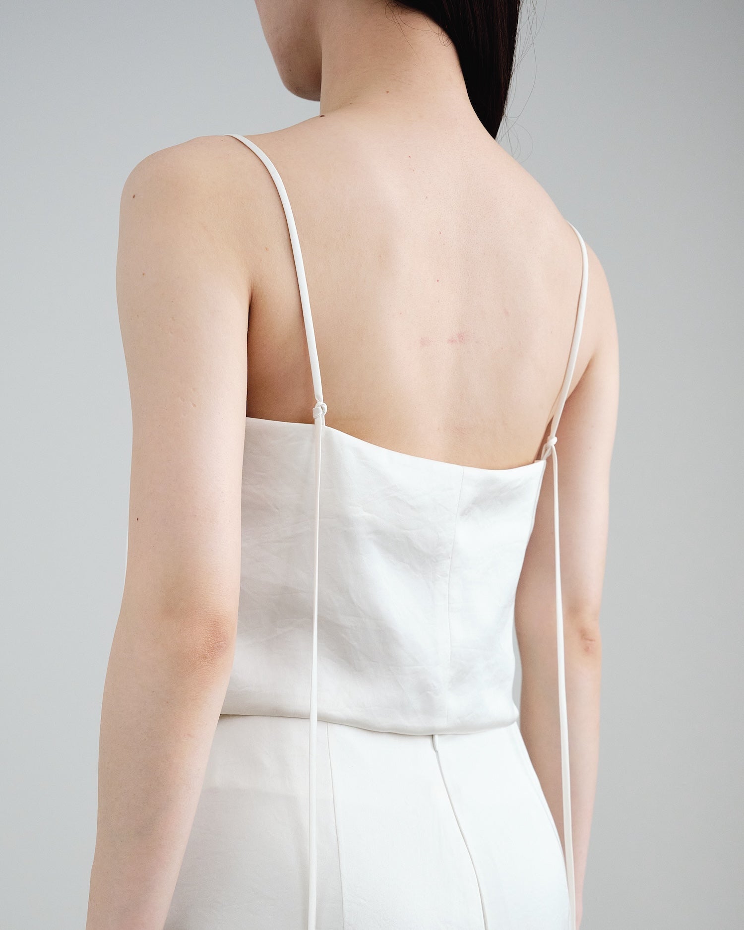 ほどよい光沢を使用しサイドに施したタッキングがアクセントになったモダンなトップス。華奢なストラップを備え、ミニマルなデザインながら存在感のある1着です。