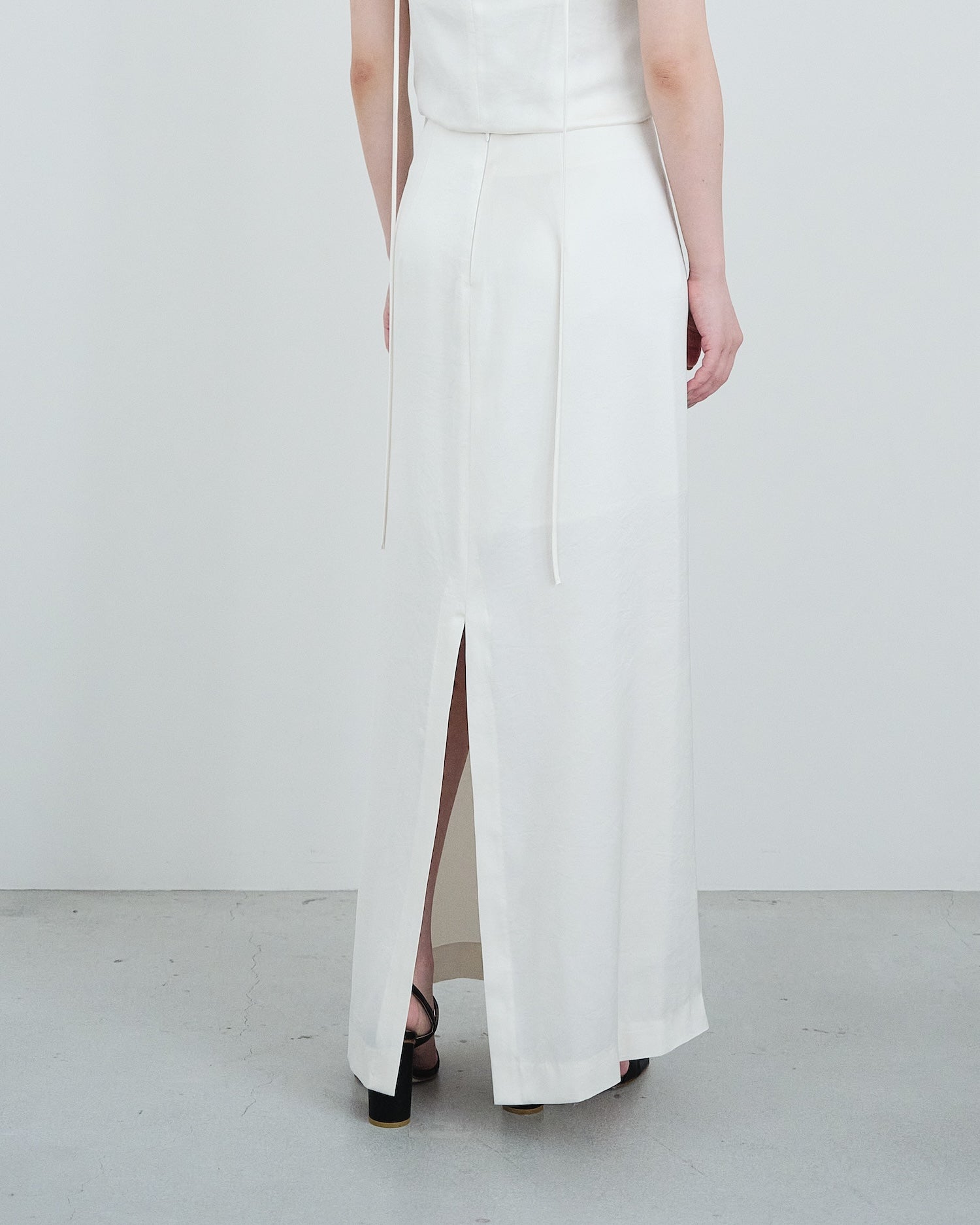 程よい光沢を持つサテン素材を使用した、ストレートシルエットのスカート。無駄のないシンプルなラインに、バックスリットが軽やかな抜け感と動きやすさをプラスします。ミニマルながらも素材の存在感が際立ち、トップスを選ばず幅広いスタイリングに対応できる一枚です。同素材の〈サテンサイドタックキャミソールトップス〉(別売り)と合わせれば、セットアップとしてオケージョンシーンにも最適。程よい光沢とミニマルなラインが、フォーマルな場にふさわしい洗練されたスタイルを演出します。ウェディングの二次会やゲストドレスとしても活躍し、特別な日の装いに上品さと華やかさをプラス。さらにデイリーでは、Tシャツやニットと合わせるだけでモード感のある着こなしに仕上がり、オン・オフ問わず万能に使えるアイテムです。