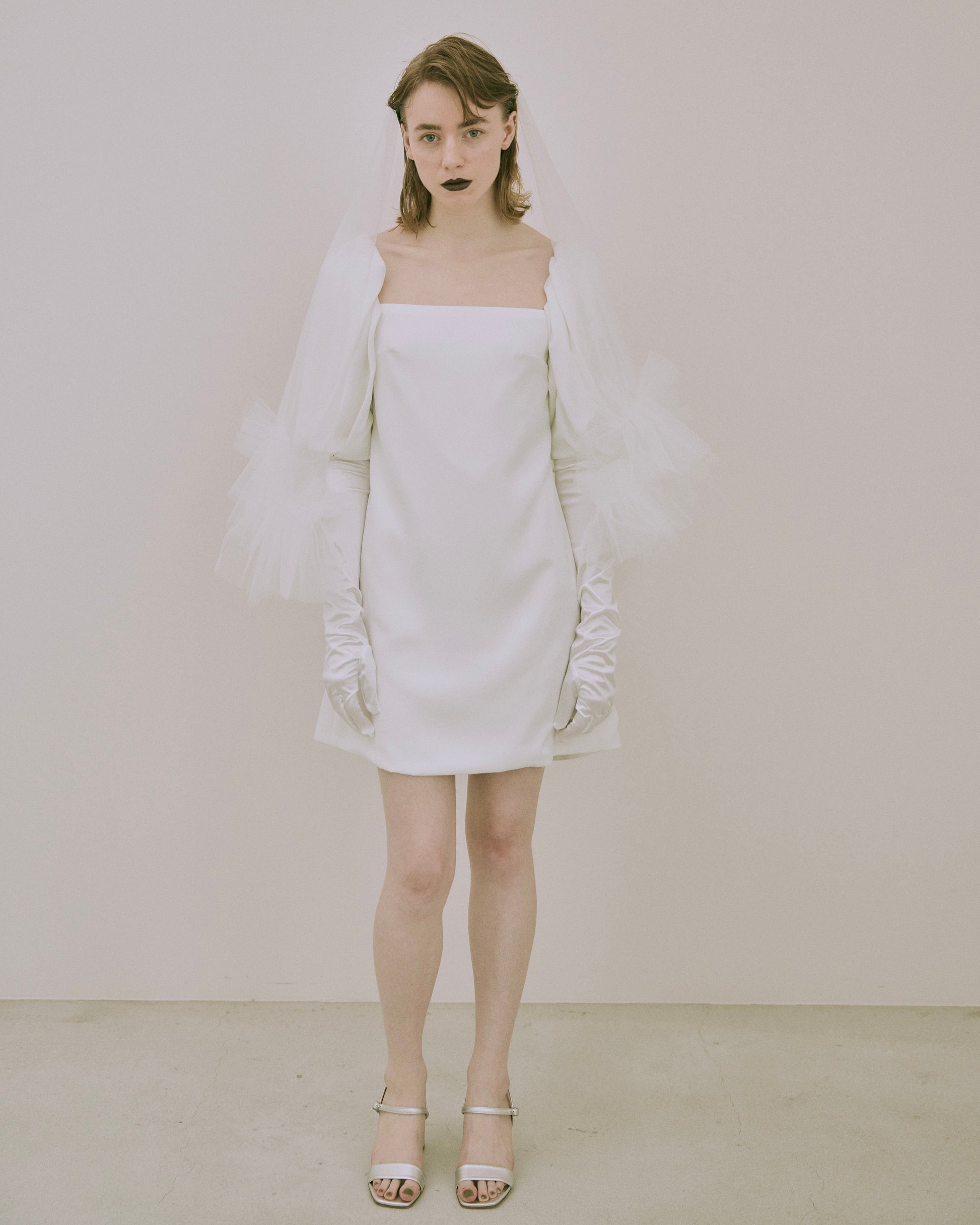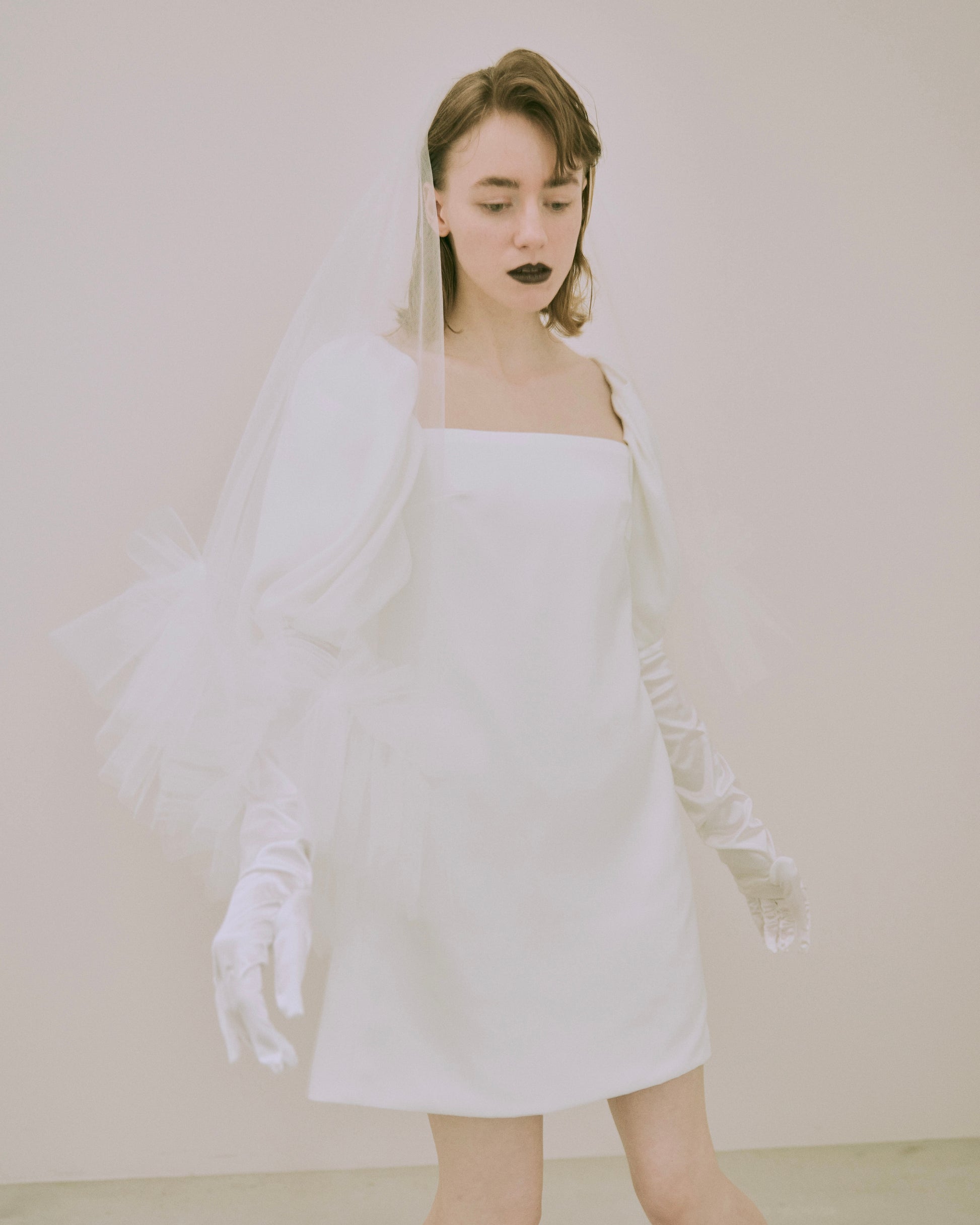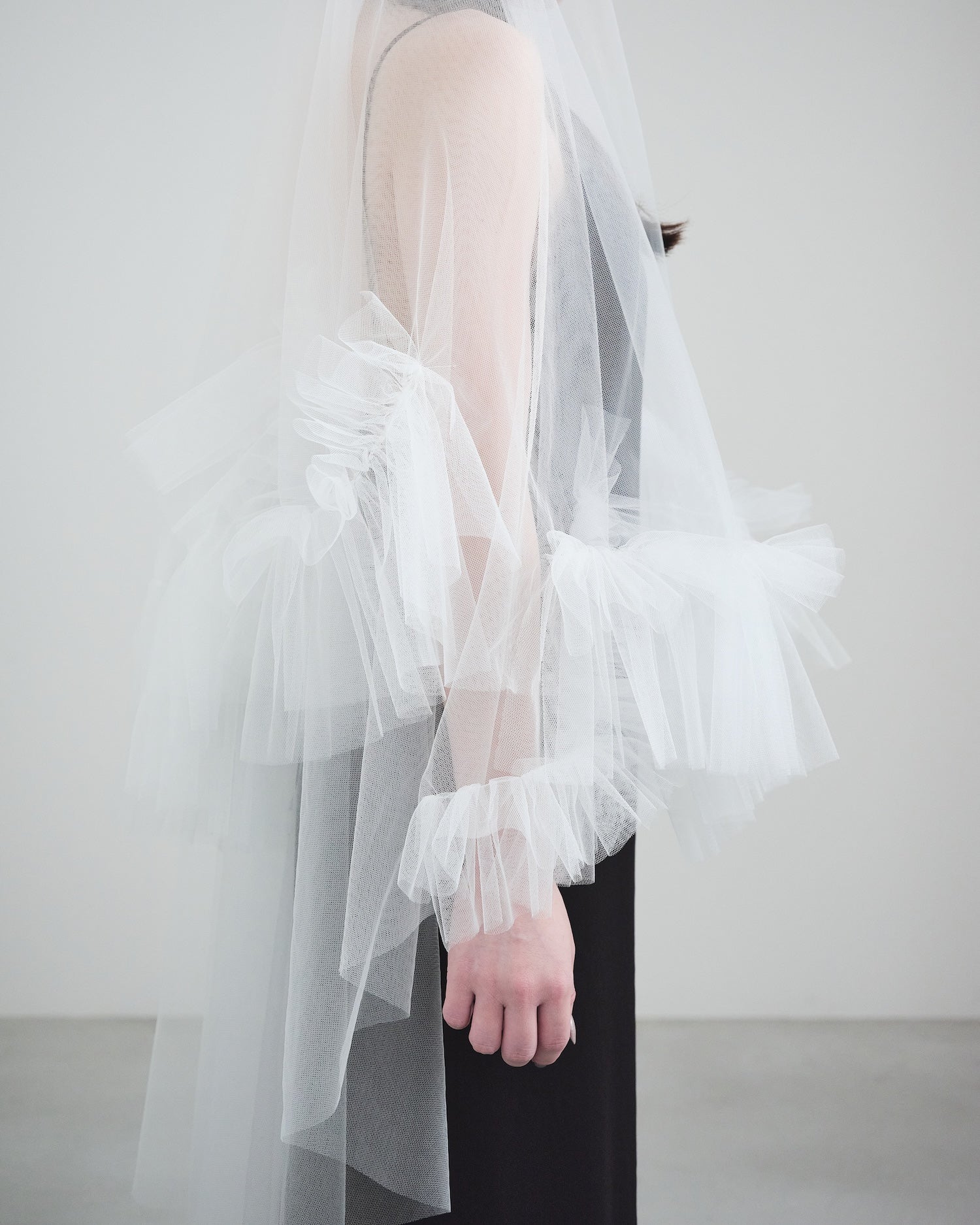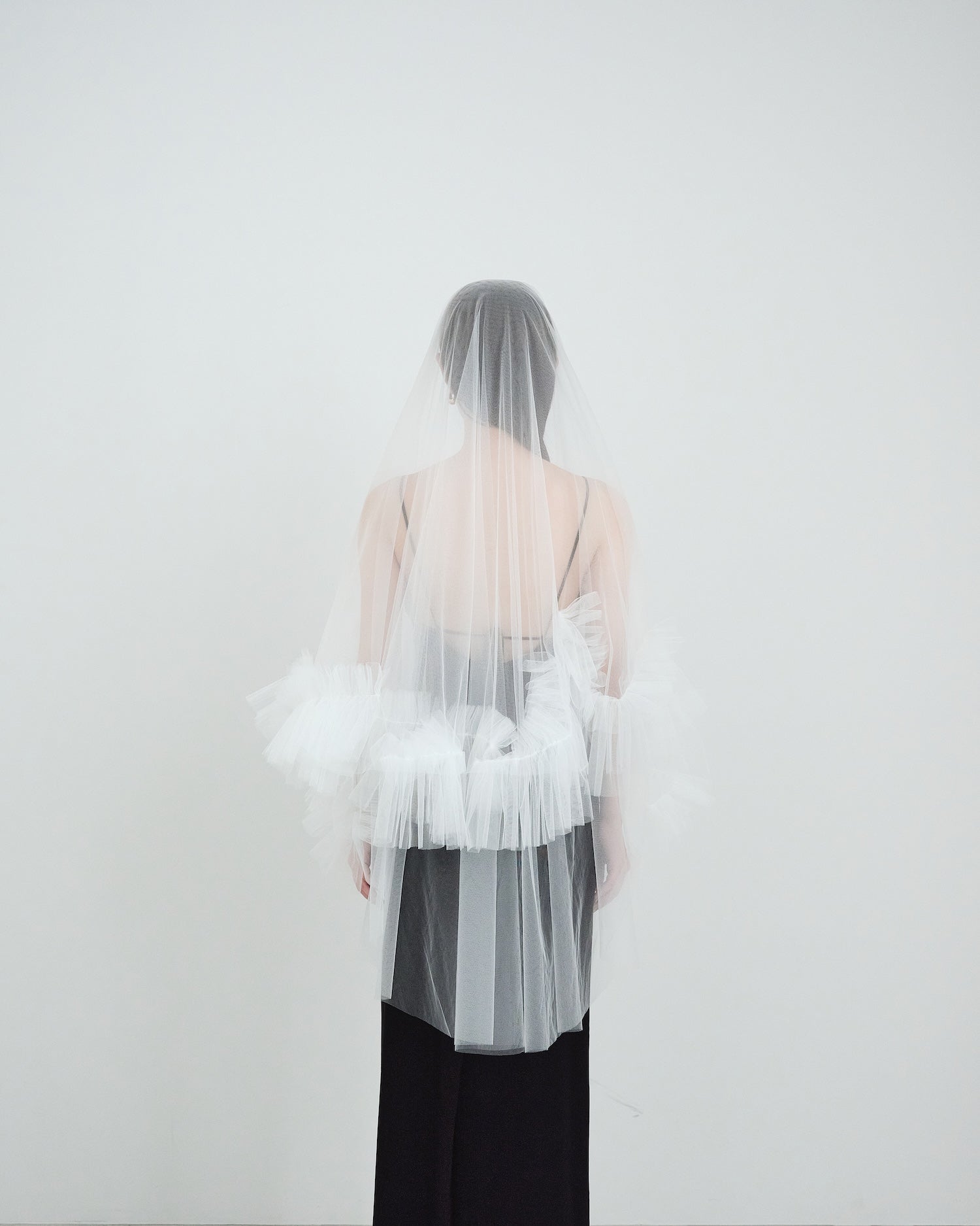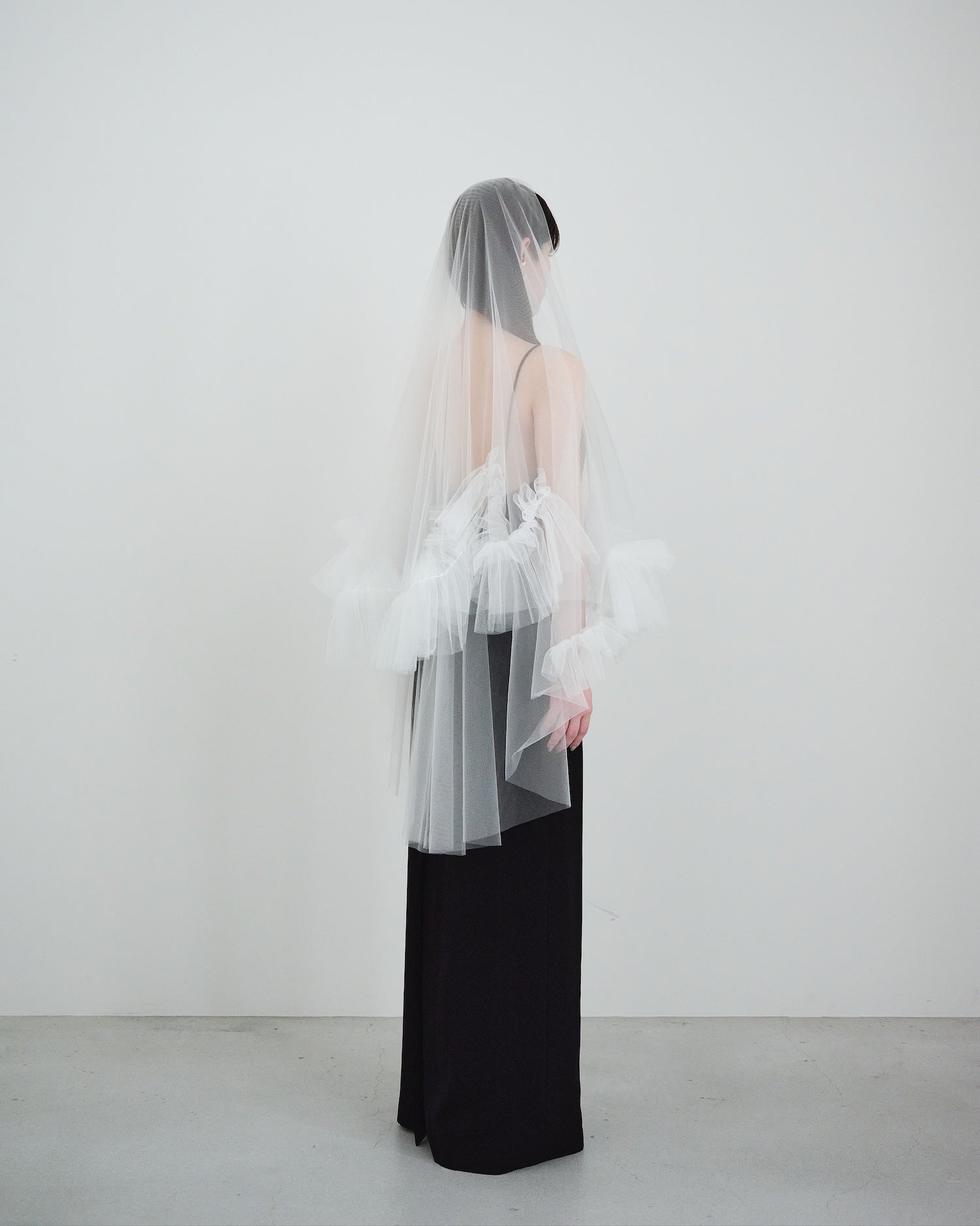 裾全体にたっぷりとギャザーを寄せたチュールを施し、立体的なボリュームを持たせたベール。程よい厚みと空気感のあるチュールがシルエットに表情を与え、正面・横顔・後ろ姿のどの角度からも印象的なスタイリングを叶えます。ドレスに合わせることで自然な華やかさが加わり、シンプルなデザインのドレスには動きのあるアクセントとして、またディテールのあるドレスにはバランスを整える仕上げ役として活躍します。軽やかでモダンな印象を与えるベールは、前撮りや挙式、パーティーなど幅広いシーンで取り入れやすく、ウェディングスタイルに程よい華やぎと立体感をプラスします。